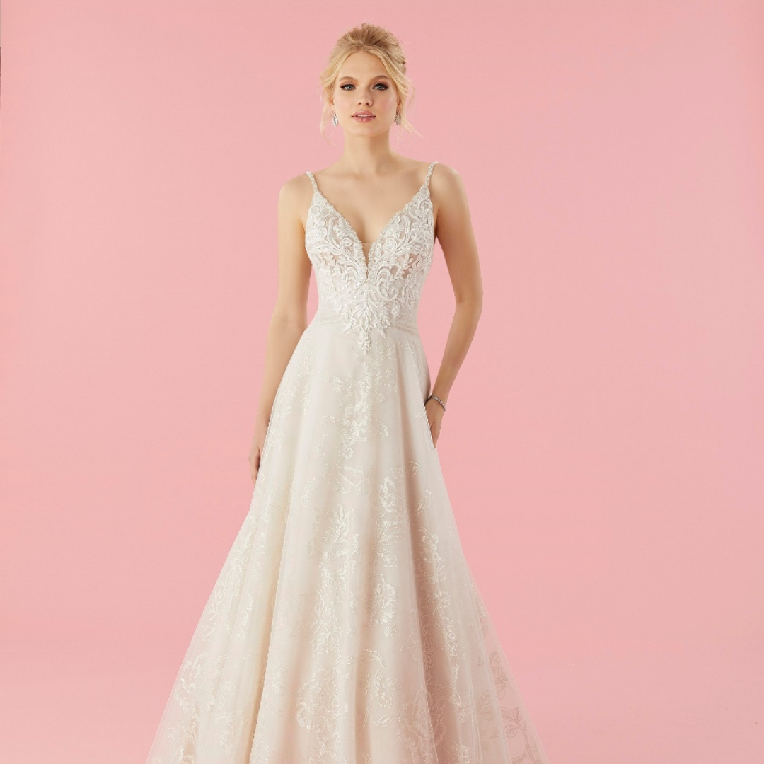 Abito da sposa silhouette A-Line. Corpetto con spalline ricamate con perline di cristallo e applicazioni in pizzo. Gonna in soffice tulle con fantasia floreale vedo non vedo.