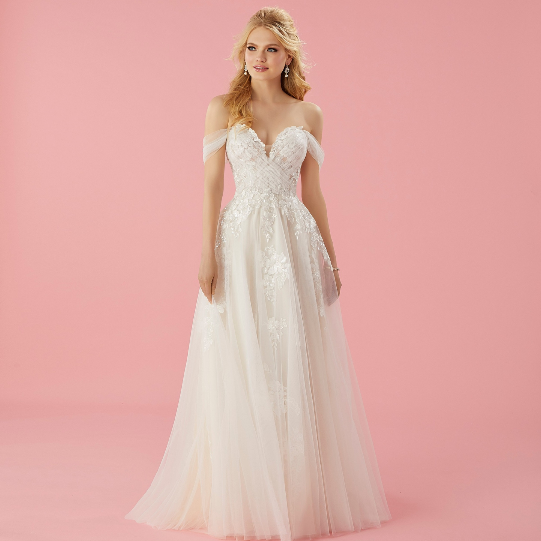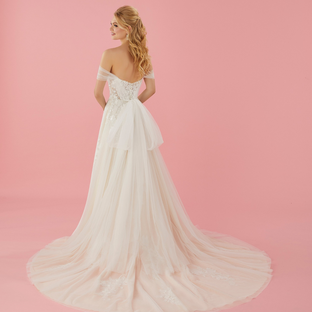 Abito sposa silhouette A-style in morbido tulle ricamato . Spalline omerali ,removibili, cadenti sul retro che terminano in un fiocco.
