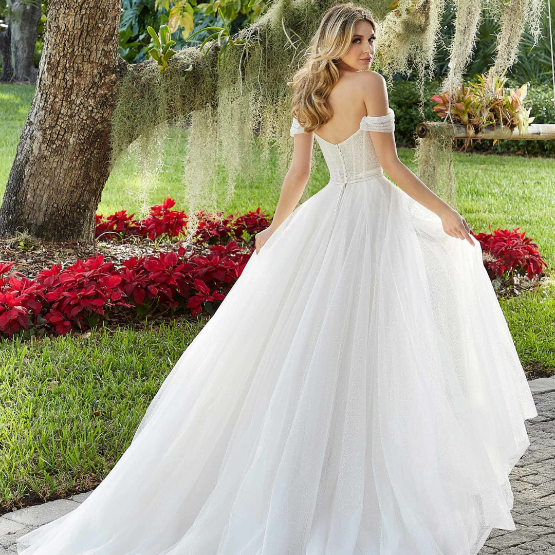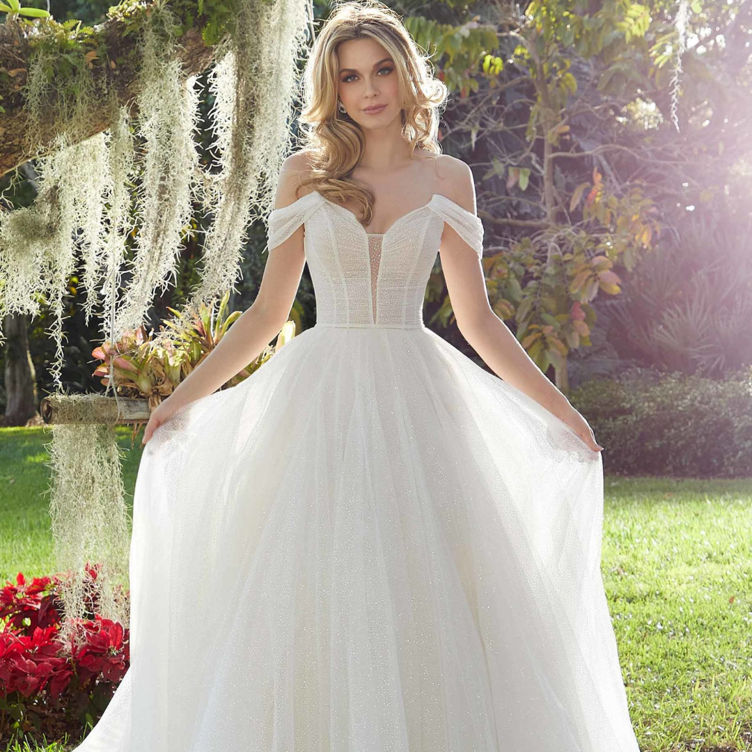 Abito da sposa silhouette A-style. Ha un corpetto steccato con dettagli trasparenti e profonda scollatura. Maniche omerali da sogno in rete scintillante.