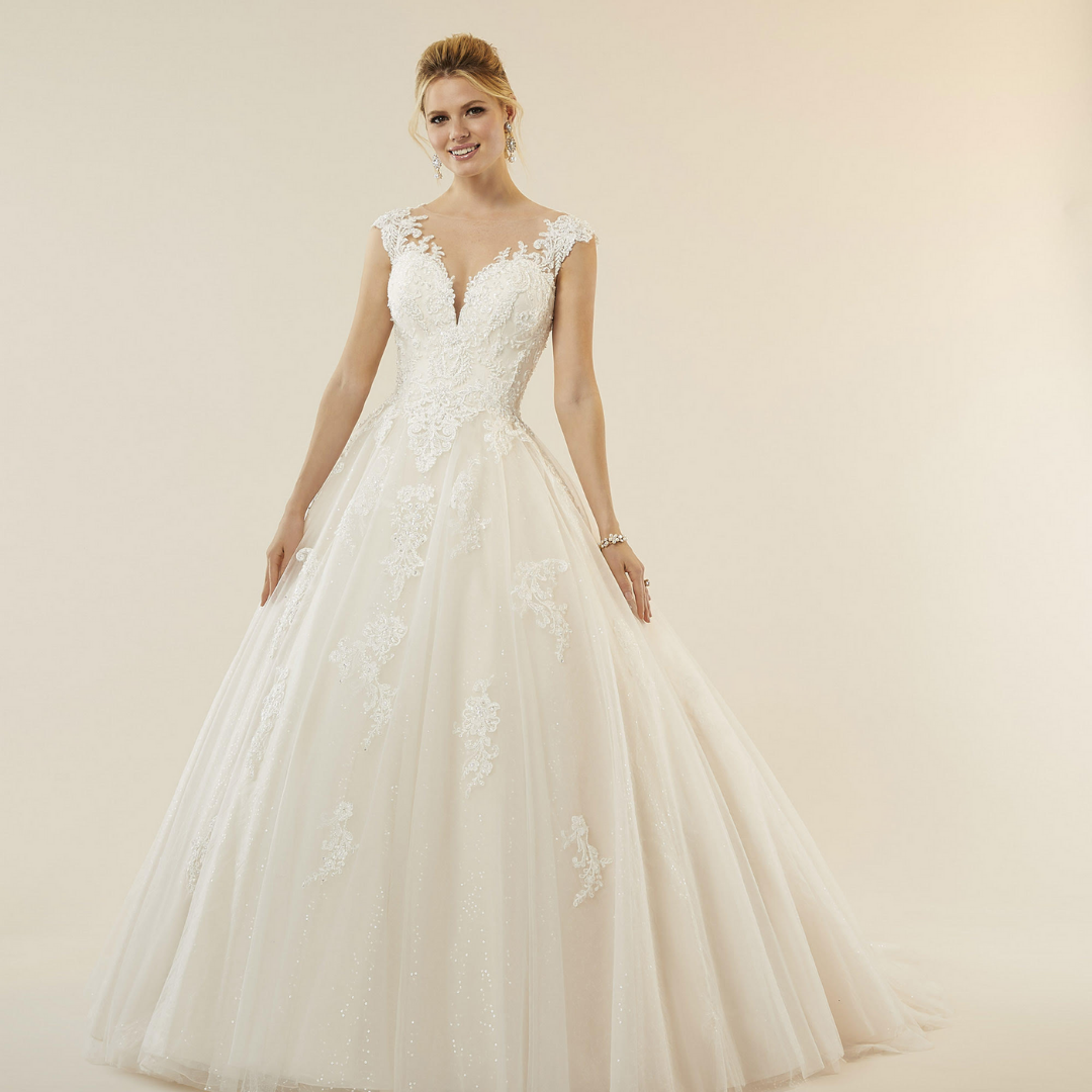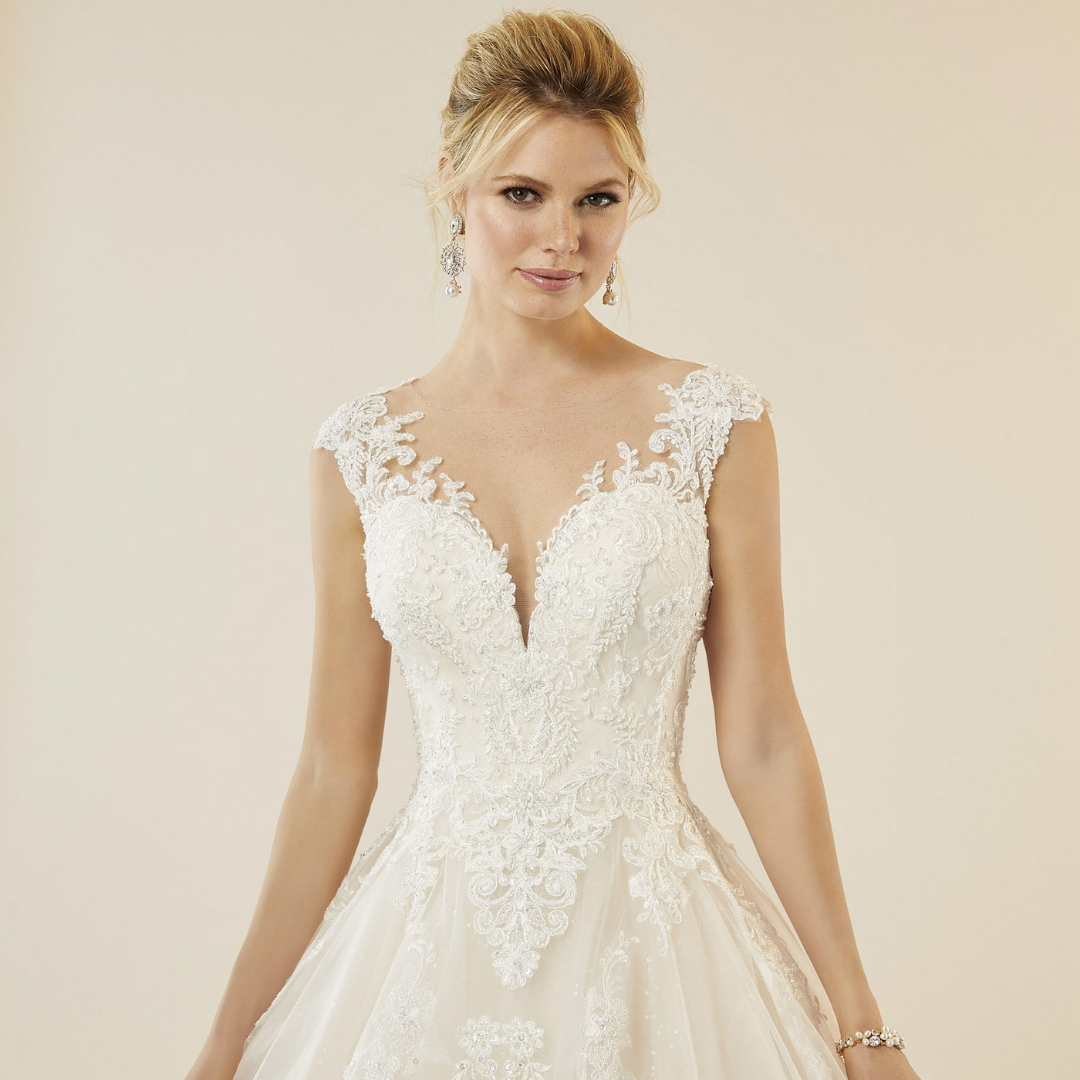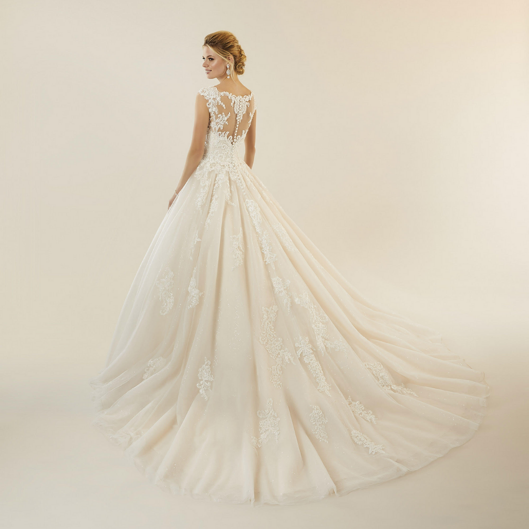 Abito da sposa in morbido tulle e organza, silhouette Ball Gown. Corpetto con applicazioni in pizzo chantilly ricamato con perline, paillettes e swarovski. Scollo effetto nudo.