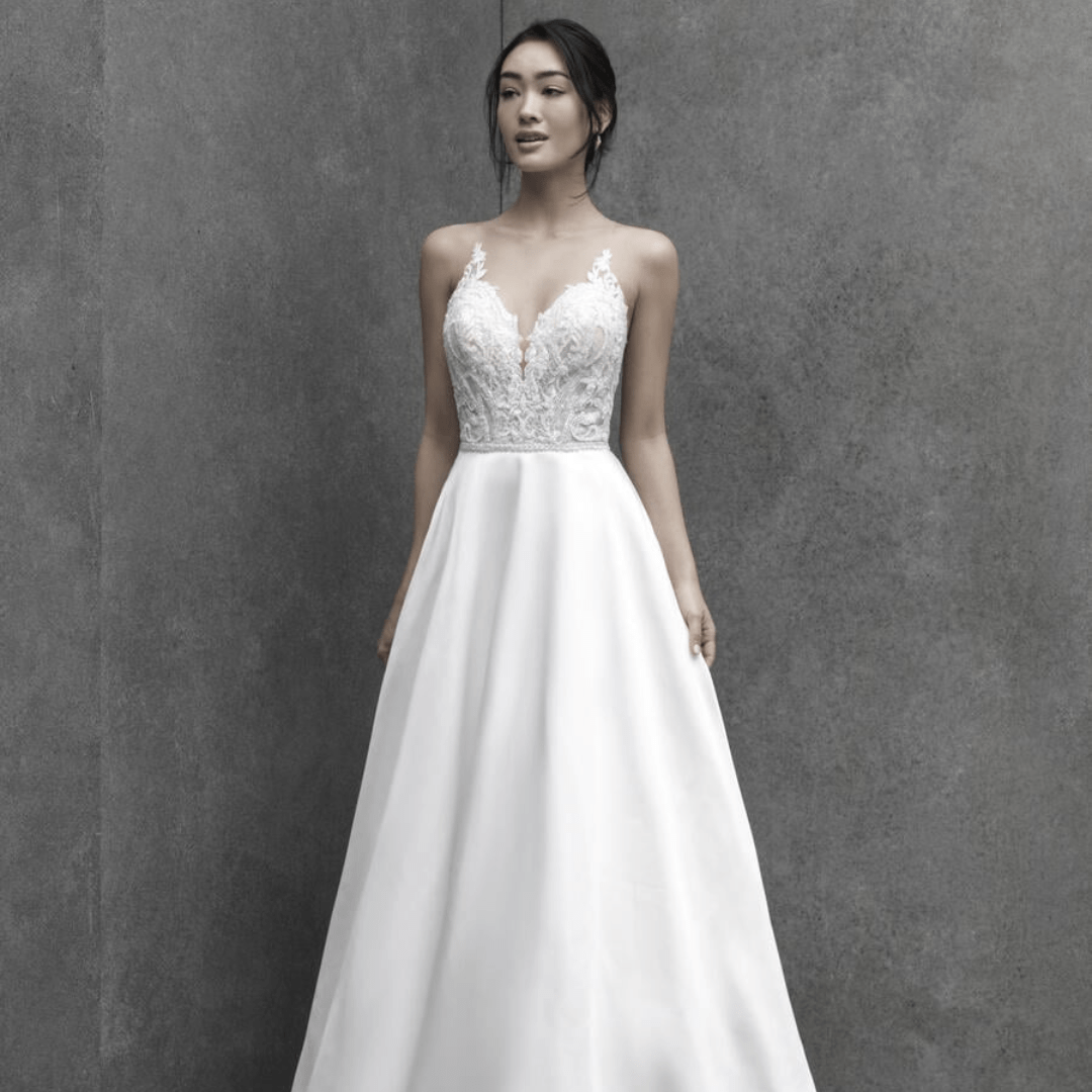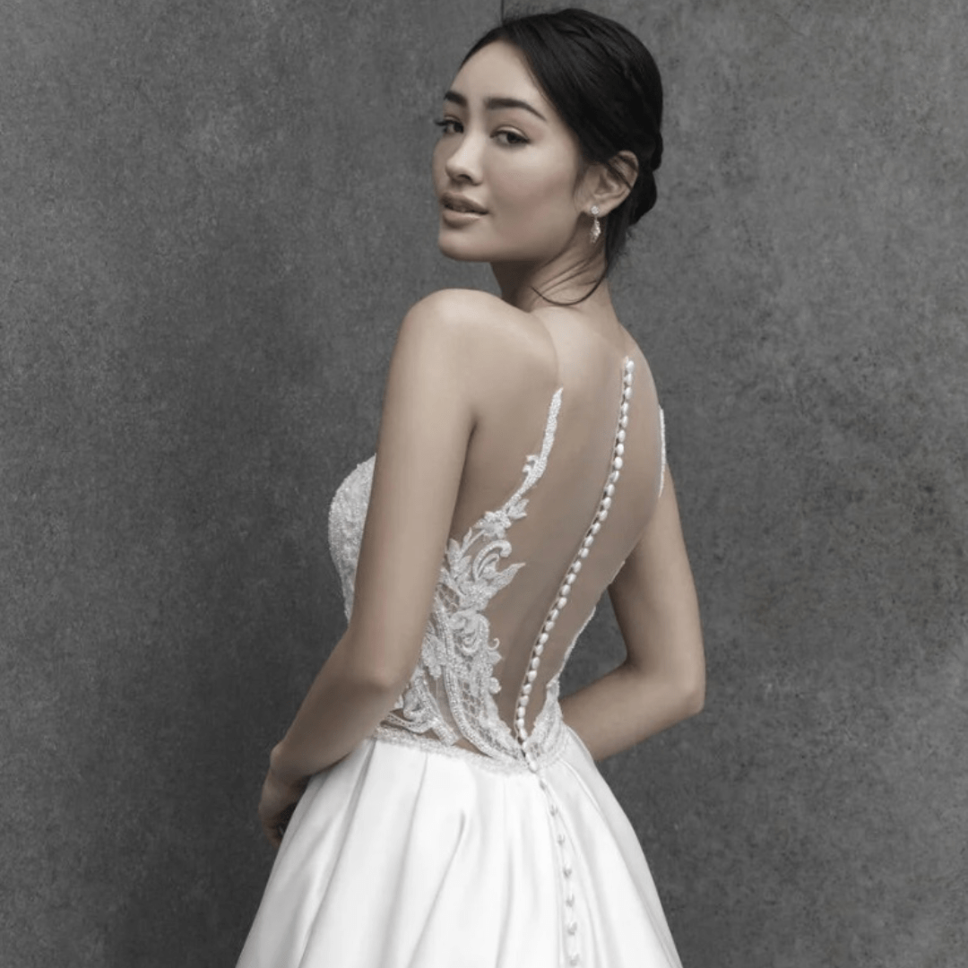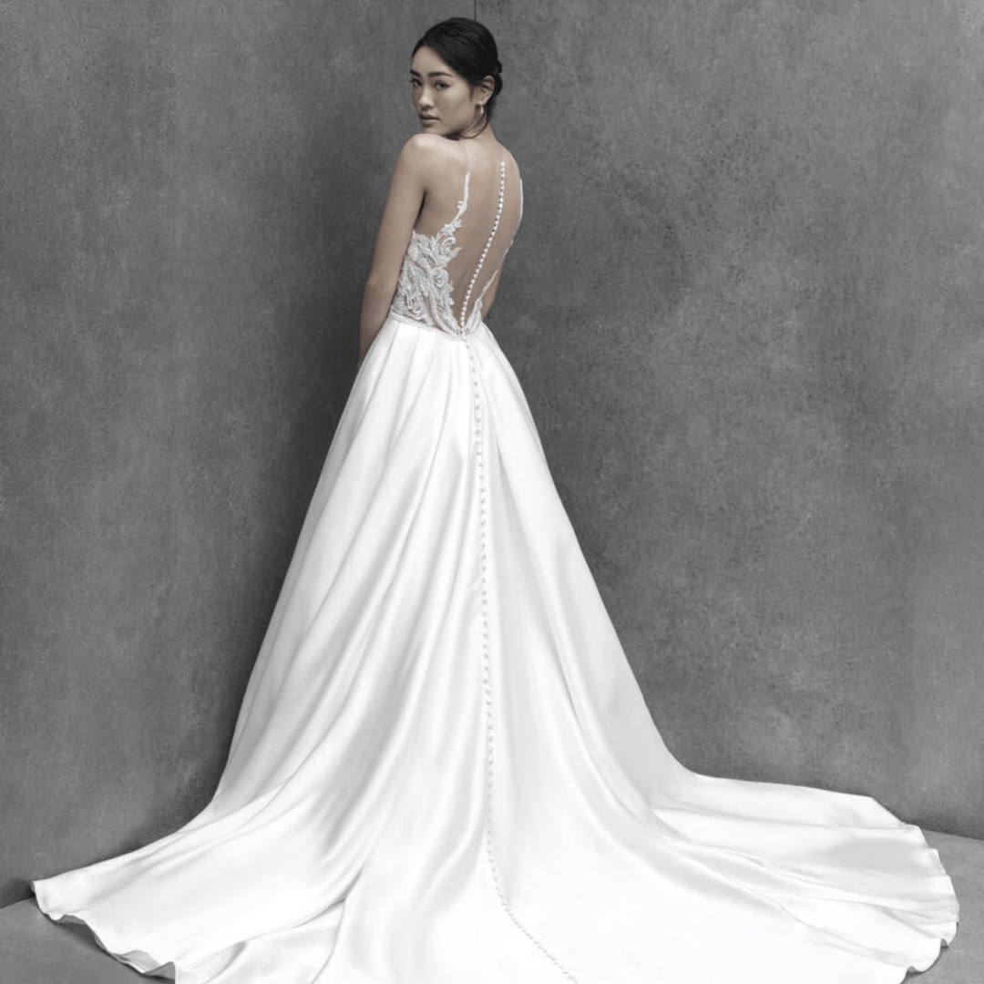 Abito da sposa modello trapezio, ha un corpetto ricamato con perline e brillanti Effetto illusione dietro e sulle spalle. Gonna in mikado con strascico elegante .