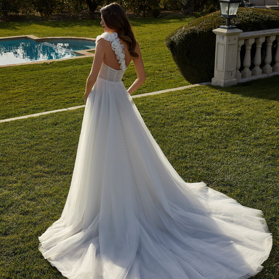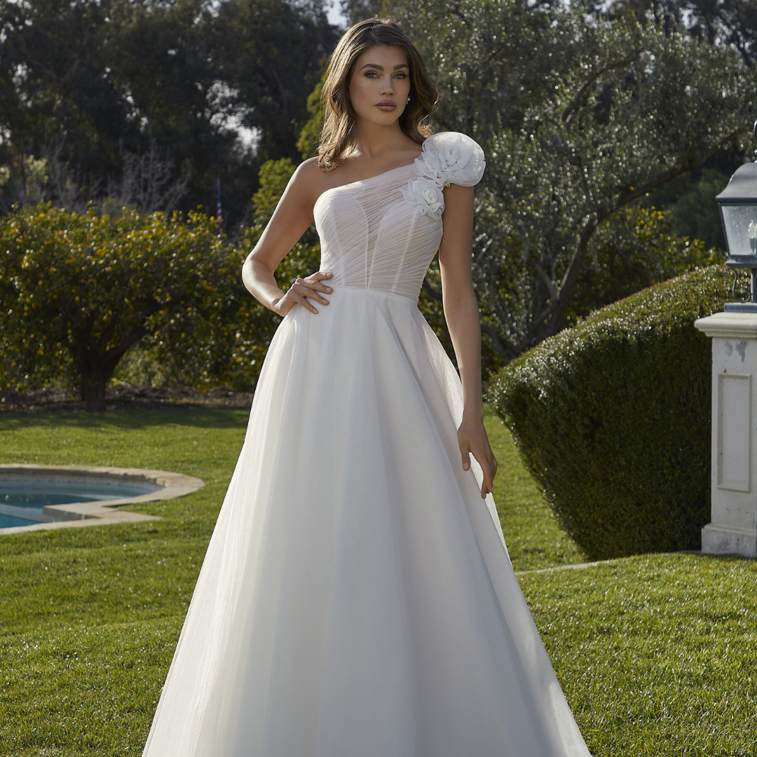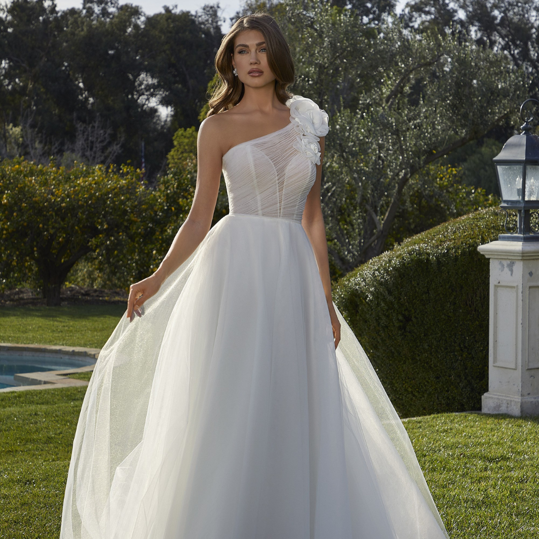 Abito da sposa silhouette A-line in raso e tulle con dettaglio floreale su monospalla. Importante strascico.