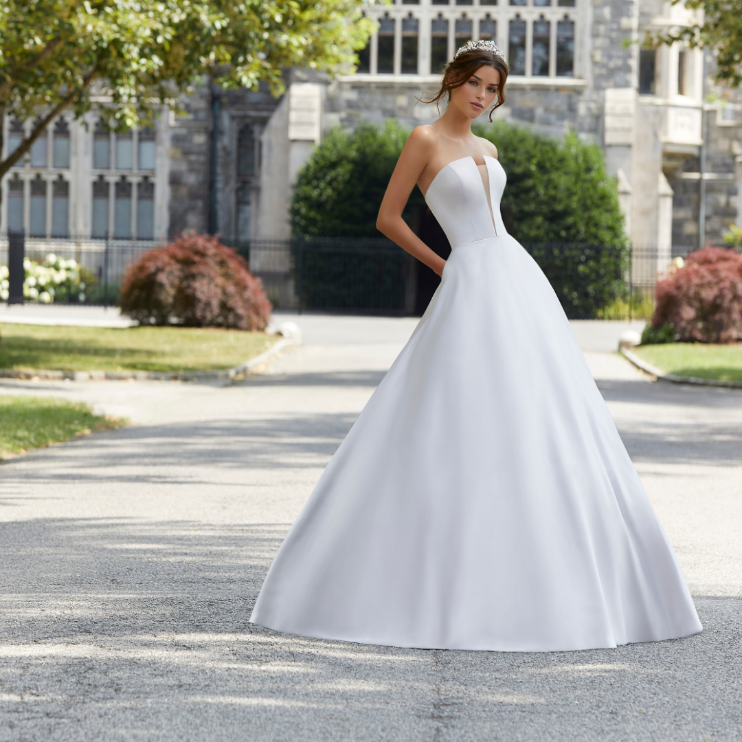 Abito sposa in raso bianco silhouette A-Line. Corpetto con inserto in tulle . In dotazione spalline con swarovski. Gonna con tasche e lungo strascico con bottoni.